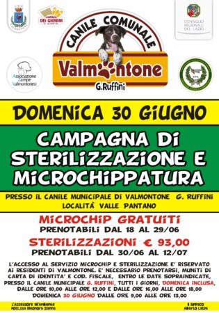 Il 30 Giugno 2019, dalle 9:00 alle 13:00, presso il Canile Comunale “G. Ruffini”- località Valle Pantano, si svolgerà la campagna di microchippatura e sterilizzazione, organizzata dal Comune di Valmontone in collaborazione con l’Associazione Zampe Valmontonesi.