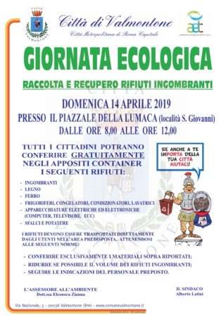 Domenica 14 Aprile, dalle ore 8 alle 12:00, al Piazzale della Lumaca (località S. Giovanni), si terrà una Giornata Ecologica per la raccolta e il recupero di rifiuti ingombranti, al fine di agevolare lo