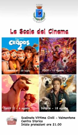 A partire dal 28 luglio 2022 fino al prossimo 18 agosto, con inizio delle proiezioni alle ore 21, nell'estate cittadina torna la programmazione de "Le Scale del Cinema"; presso la Scalinata delle Vittime Civili (Corso Garibaldi) nel cuore del Centro Storico di Valmontone.