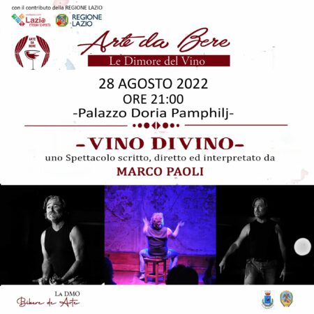 L'ultima domenica di agosto 2022, il giorno 28, il suggestivo Palazzo Doria Pamphilj di Valmontone ospita una serata tra il buon gusto del bere e il teatro: in scena "Vino Divino" (di Marco Paoli).