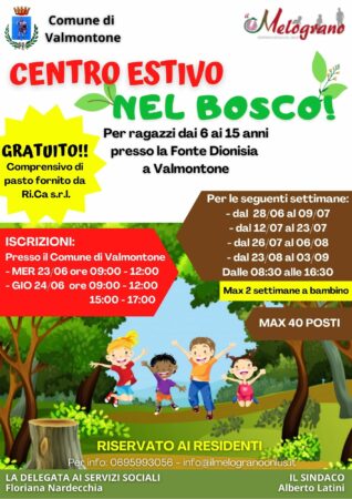 per i ragazzi dai 6 ai 15 anni presso la Fonte Dionisia di Valmontone. Il centro Estivo compreso di pasto è totalmente gratuito!!!!!!