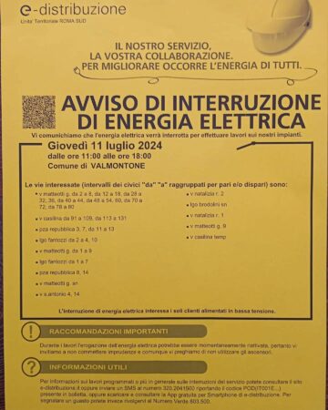 E-distribuzione informa che giovedì 11 luglio 2024, dalle ore 11:00 alle ore 18:00, verrà interrotta l'energia elettrica per consentire lavori di manutenzione sui nostri impianti.