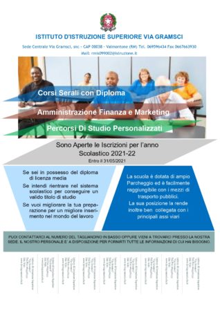 L’ Istituto d’ Istruzione Superiore “Via Gramsci” – Valmontone anche per l’ anno scolastico 2020/2021 organizza sessioni di corsi pomeridiani – serali.