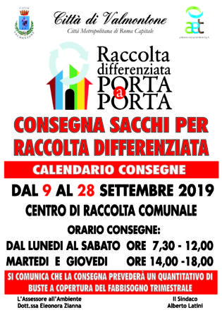 Si comunica alla cittadinanza che dal 9 al 28 settembre 2019 presso il Centro di Raccolta Comunale in Via Casilina ci sarà la consegna di buste per la raccolta differenziata per una copertura trimestrale.