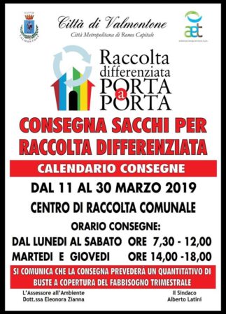 Si comunica alla cittadinanza che dal 11 al 30 marzo 2019 presso il Centro di Raccolta Comunale in Via Casilina ci sarà la consegna di buste per la raccolta differenziata per una copertura trimestrale.