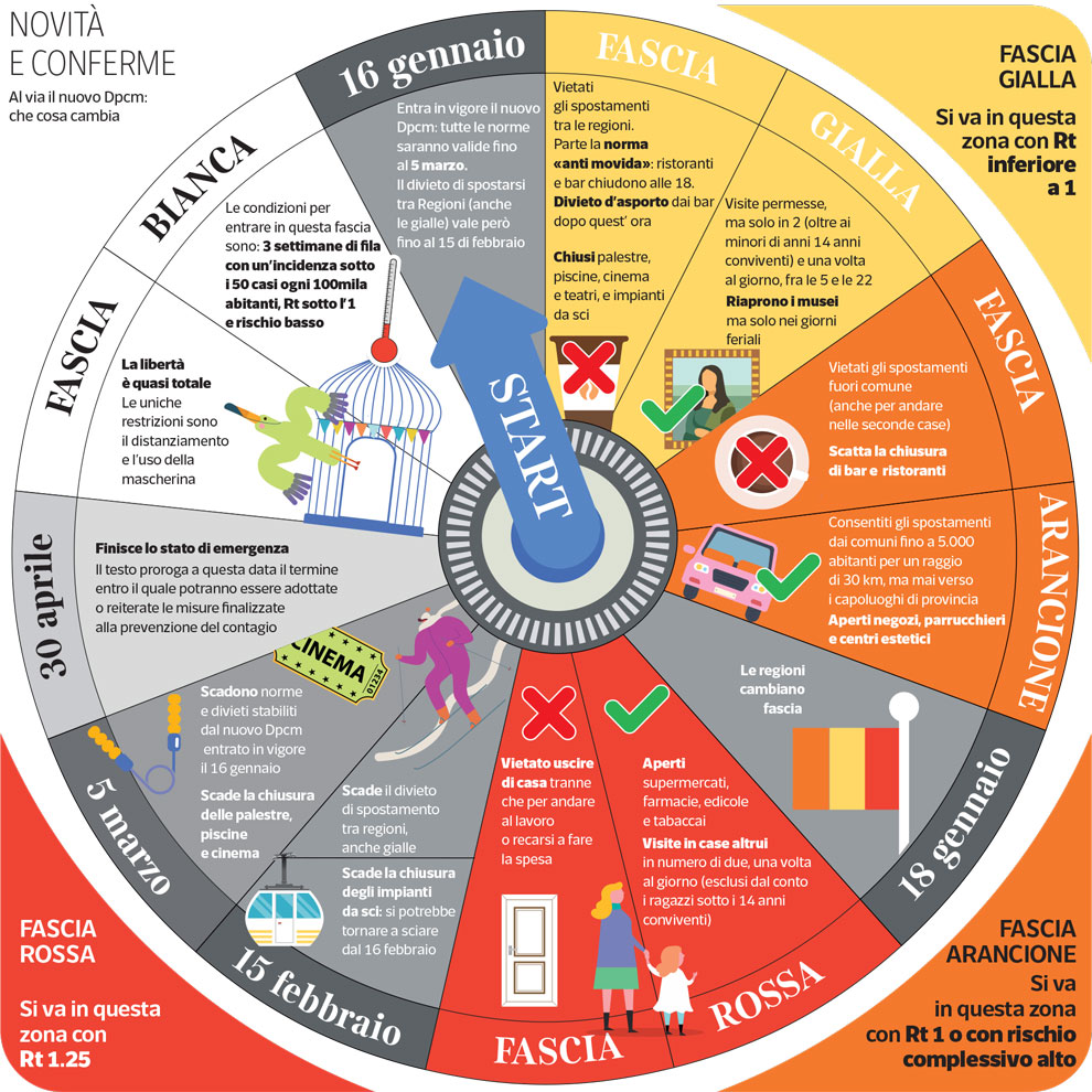 Una infografica pubblicata sul sito internet del Corriere della Sera, spiega tutte le novità, cosa si potrà e non si potrà fare.