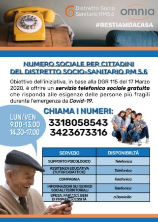 I comuni associati del Piano di Zona, distretto socio-sanitario Colleferro RM 5.6, istituiscono, in base alla DGR 115 del 17 Marzo 2020, uno sportello telefonico sociale gratuito per rispondere alle esigenze delle persone più fragili durante l’emergenza COVID-19.