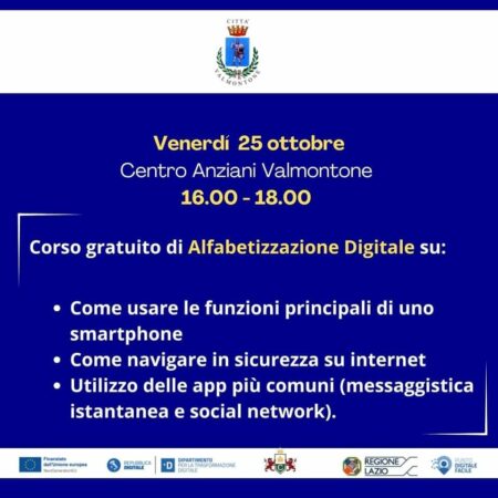 Si informa la cittadinanza di Valmontone che, venerdì 25 OTTOBRE 2024, presso il Centro Sociale Anziani, dalle ore 16 alle 18, si svolgerà un CORSO GRATUITO di ALFABETIZZAZIONE DIGITALE.