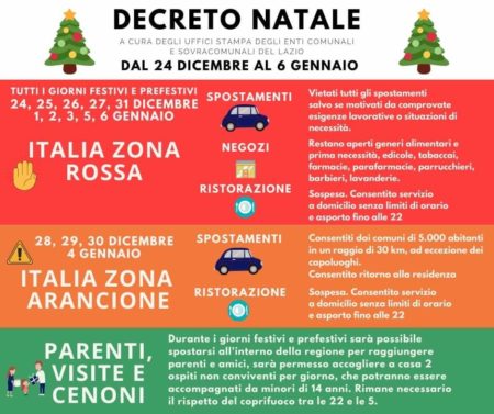 Dal 24 dicembre 3020 fino al 6 gennaio 2021 l‘ intera nazione italiana sarà ununica zona rossa, ad eccezione di quattro giorni arancioni (28, 29, 30 dicembre 2020 e 4 gennaio 2021).