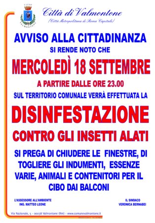 Si informa la cittadinanza di Valmontone che, mercoledì 18 settembre 2024 (a partire dalle ore 23), è in programma – su tutto il territorio comunale – la disinfestazione contro gli insetti alati.