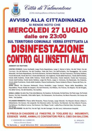 Si informa la cittadinanza di Valmontone che, mercoledì 27 luglio 2022 a partire dalle ore 23, verrà effettuato un ciclo di disinfestazione contro gli insetti alati (moscerini).