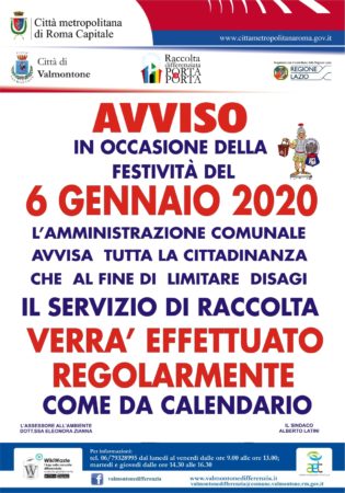 In occasione della festività del 6 Gennaio 2020, l’Amministrazione Comunale comunica che il servizio di raccolta rifiuti verrà effettuato regolarmente come da calendario.