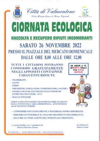 Si informa la cittadinanza di Valmontone che, il giorno 26 novembre 2022, come da programma di seguito pubblicato, è in agenda una Giornata Ecologica.