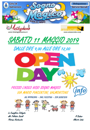 Gli operatori dell’Asilo Nido saranno lieti di accogliere le famiglie e i bambini il giorno 11 maggio dalle ore 9,00 alle ore 12,00 presso la sede dell’Asilo Nido per l’Open Day.
