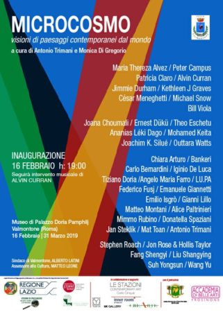 Microcosmo è una mostra pensata per accogliere opere di artisti provenienti da tutto il mondo. Il Microcosmo era il “mondo in piccolo” che Camillo Pamphilj, alla metà del Seicento, intendeva ricreare in questa sua residenza extraurbana, affidando ad alcuni dei maggiori artisti del tempo le raffigurazioni allegoriche dei quattro elementi e delle quattro parti del mondo allora conosciute.