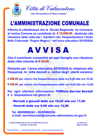 L’Amministrazione Comunale informa la cittadinanza che la Giunta Regionale ha concesso al nostro Comune un contributo di € 15.806,00, destinato alla riduzione delle rette per i bambini che frequenteranno l’Asilo Nido Comunale “Sogno Magico” nell’anno educativo 2019/2020.