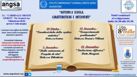 Dal 29 ottobre al 21 novembre, presso i locali dell'Istituto Comprensivo Oreste Giorgi di Valmontone, si svolgerà il seminario di informazione organizzato e promosso dall'associazione nazionale genitori soggetti autistici ANGSA LAZIO con i contributi dell'8 per mille della Chiesa Valdese, in collab...