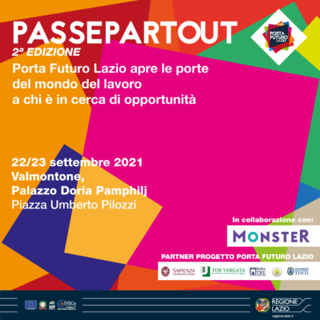 La Regione Lazio, con DiSCo e Porta Futuro Lazio, in collaborazione con Monster, organizza la seconda edizione di PASSEPARTOUT , che si terrà in presenza il 22 e il 23 settembre 2021, a Valmontone , presso il Palazzo Doria-Pamphilj, Piazza Umberto Pilozzi.