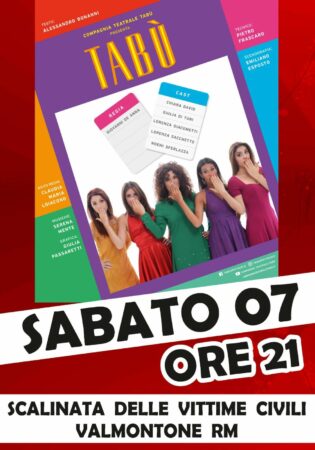 Alle ore 21 di oggi, sabato 7 agosto 2021, nuovo appuntamento con il cartellone "Estate a Teatro"; presso la "Scalinata delle Vittime Civili", nel cuore del Centro Storico di Valmontone.