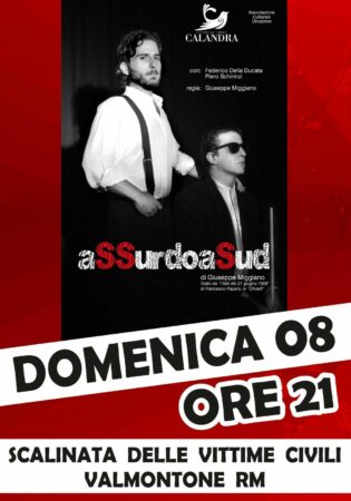 Chiusura in bellezza, per il cartellone "Estate a Teatro", stasera (8 agosto 2021) alle ore 21: presso la "Scalinata delle Vittime Civili", nel cuore del centro storico di Valmontone, in scena "aSSurdoaSud" (di Giuseppe Maggiano).