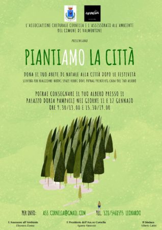 Per il periodo natalizio 2019/2020, l’ associazione “Cornelia”, in collaborazione con l’ assessorato all’ Ambiente della Città di Valmontone, promuove “Piantiamo la Città” : piantumazione degli alberi che, terminate le festività Natalizie, è giusto che abbiano un proseguo naturale della loro esistenza.