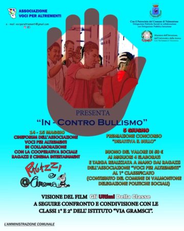 Nei giorni 14-15 maggio 2019 l’Associazione di volontariato Voci per Altrementi in collaborazione con il Comune di Valmontone Delegazione politiche sociali e Delegazione pubblica istruzione unitamente al Sindaco e tutta l’amministrazione comunale, organizzano presso l’ I.I.S. via Gramsci “In_contro bullismo”, e concorso disattiva il bullo, evento di sensibilizzazione contro il fenomeno del bullismo rivolto alle classi I e II.