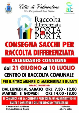 Si informano i cittadini di Valmontone che, a partire da oggi, 21 giugno 2021, fino al 10 luglio prossimo, è in corso la consegna dei sacchi per la Raccolta Differenziata.