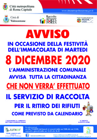 Si comunica che, nella giornata di martedì 8 dicembre 2020, a Valmontone non si effettuerà la raccolta dei rifiuti.