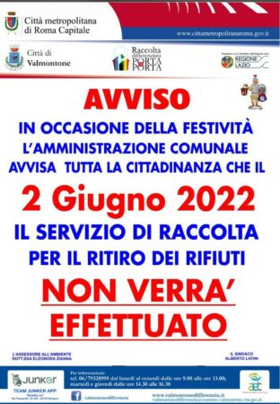 Si informa la cittadinanza di Valmontone che, il giorno 2 giugno 2022, il servizio di raccolta e ritiro dei rifiuti NON verrà effettuato.