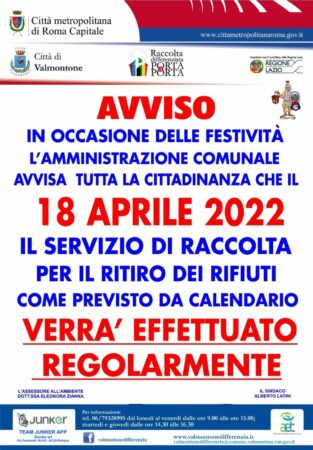 Si informa che, nella Città di Valmontone, il giorno 18 aprile 2022 il servizio di raccolta e ritiro dei rifiuti – come da calendario – verrà effettuato regolarmente.