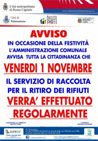 Si informa la cittadinanza di Valmontone che, il giorno 1 novembre 2024, il servizio di raccolta per il ritiro dei rifiuti verrà effettuato regolarmente.