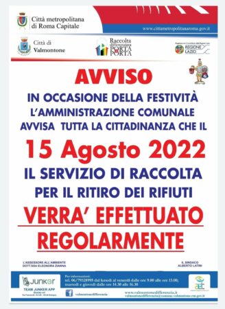 Si informa che, nella Città di Valmontone, il giorno 15 agosto 2022 il servizio di raccolta per il ritiro dei rifiuti verrà effettuato regolarmente.