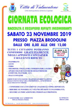 Sabato 23 Novembre dalle ore 8,00 alle 12,00, presso Piazza Brodolini, si terrà la Giornata Ecologica per la raccolta e lo smaltimento di rifiuti ingombranti.