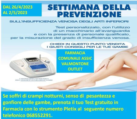 Si informa la cittadinanza di Valmontone che, dal 26 aprile al 2 maggio 2023, la Farmacia Comunale al Valmontone Outlet promuove, gratuitamente, iniziative sull’insufficienza venosa degli arti inferiori.