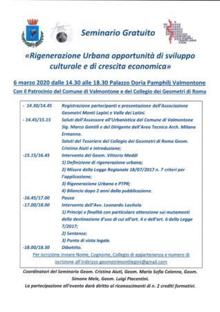 Nel pomeriggio di venerdì 6 marzo 2020, dalle ore 14:30 alle 18:30, Palazzo Doria Pamphilj sarà la location del  seminario gratuito “Rigenerazione Urbana opportunità e sviluppo culturale e di crescita economica” che, organizzato dal Collegio provinciale dei geometri e dei geometri laureati di Roma, è patrocinato dalla Città di Valmontone.