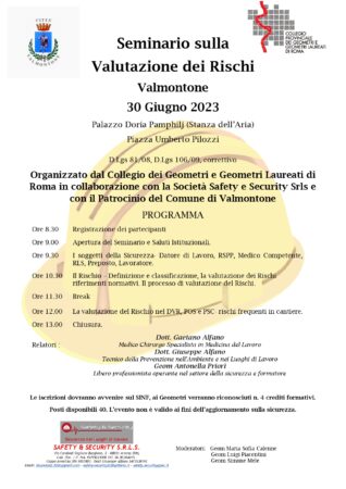 Il Collegio dei Geometri e Geometri Laureati di Roma in collaborazione con la società Safety e Security Srls, e con il Patrocinio del Comune di Valmontone, organizza un Seminario sulla Valutazione dei Rischi.