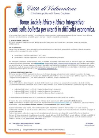 Per conoscere le condizioni di ammissione al bonus, le modalità di richiesta, la documentazione da presentare e per ogni altro dettaglio consultare il sito dell’Autorità alla pagina Bonus Acqua (https://www.arera.it/it/consumatori/idr/bonusidr.htm) oppure presso l’Ufficio dei Servizi Sociali del Comune di Valmontone aperto al pubblico ogni martedì e giovedì dalle ore 15,00 alle ore 17,00 e il venerdì dalle ore 9,00 alle ore 12,00. Si può scaricare l’apposito modulo sul sito istituzionale all’indirizzo www.comune.valmontone.rm.it. Tutte le informazioni si possono richiedere il mercoledì dalle ore 10,00 alle ore 11,00 al numero telefonico 0695990271.