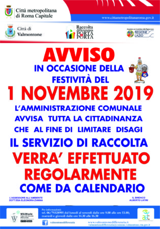 In occasione della festività del 1 Novembre 2019, si comunica ai cittadini di Valmontone che, il servizio di raccolta differenziata, previsto sul territorio comunale, verrà effettuato regolarmente da parte degli operatori della società Ambi.En.Te. Spa di Ciampino, sia per le utenze domestiche che non domestiche.