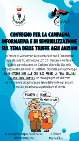 Si informa la cittadinanza di Valmontone che, il 28 ottobre 2022, alle ore 18, presso la Sala dell’Aria di Palazzo Doria Pamphilj, è in programma un convegno di approfondimento in materia di truffe agli anziani.