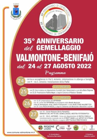 Quest’anno – 2022 – ricorre il 35esimo anniversario del gemellaggio tra Valmontone e Benifaiò.