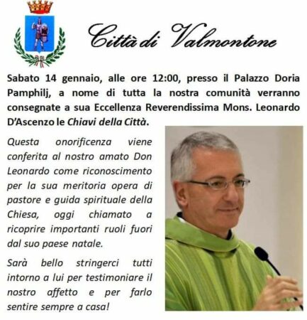 A Valmontone, sabato 14 gennaio 2023, alle ore 12, è in agenda un evento tanto importante, quanto emozionate: nella scenica location di Palazzo Doria Pamphilj Sua Eccellenza Mons. Leonardo D’Ascenzo avrà in consegna le chiavi della Città.