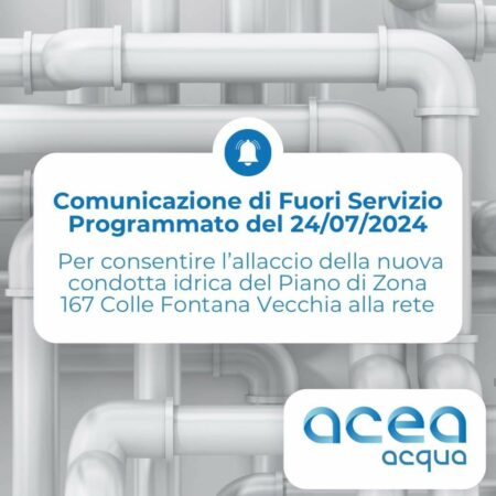 Acea Ato2: disservizio programmato, 24.07.2024 (dalle 10 alle 13)