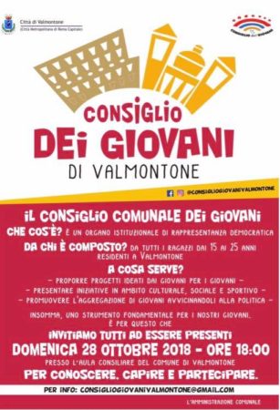 Domenica 28 ottobre alle ore 18,00 nell’Aula Consiliare del Comune di Valmontone ci sarà l’incontro per il “Consiglio Comunale dei Giovani”. Il Consiglio è un organo istituzionale di Rappresentanza Democratica di tutti i ragazzi dai 15 ai 25 anni residenti nel territorio di Valmontone. L’iniziativa ha l’obiettivo di: