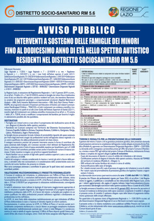 La Regione Lazio, in attuazione del Regolamento Regionale n. 1 del 15 gennaio 2019 e ss.mm., di cui all’art. 74 della L.R. n. 7 del 22/10/2018, sostiene le famiglie dei minori fi no al dodicesimo anno di età con disturbo dello spettro autistico residenti nel Lazio, che intendono liberamente avvalersi dei programmi psicologici e comportamentali strutturati (Applied Behavioural Analysis – ABA, Early Intensive Behavioural Intervention – EIBI, Early Start Denver Model – ESDM), dei programmi educativi (Treatment and Education of Autistic and related Communication Handicapped Children – TEACCH) e di altri trattamenti con evidenza scientifica riconosciuta, rientranti tra quelli di cui alle Linee Guida dell’Istituto Superiore di Sanità LG21/11, nonché degli altri trattamenti con evidenza scientifica riconosciuta di cui all’art. n. 74 comma 1 della L.R. n. 7/2018, mirati a modificare i comportamenti del bambino per favorire il migliore adattamento possibile alla vita quotidiana.