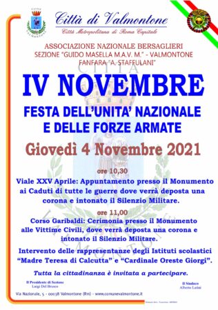 In occasione della Festa dell’Unità Nazionale e delle Forze Armate, il Sindaco della Città di Valmontone, Alberto Latini, invita tutta la cittadinanza alla Giornata di commemorazione prevista per giovedì 4 novembre 2021.