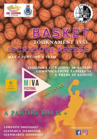 Prevista nella due giorni di festival anche un 3vs3 di street basket curato dal Consiglio dei Giovani di Valmontone. Le iscrizioni per le squadre, che possono essere composte da massimo 4 persone con età maggiore di 15 anni, è consentito fino al 28 agosto.
