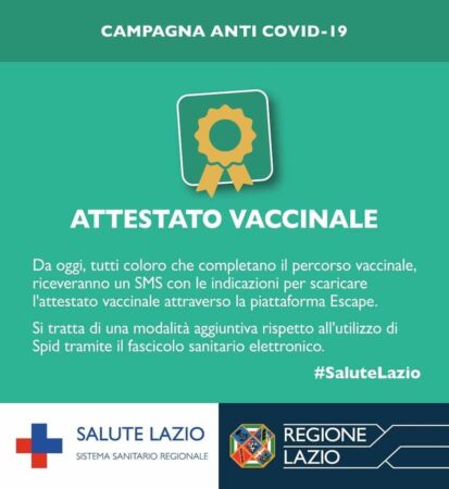 La Regione Lazio informa che, a partire dal 18 giugno 2021, tutti coloro i quali hanno completato il percorso vaccinale contro il Coronavirus, riceveranno un sms con le indicazioni per scaricare l'attestato vaccinale attraverso la piattaforma Escape.