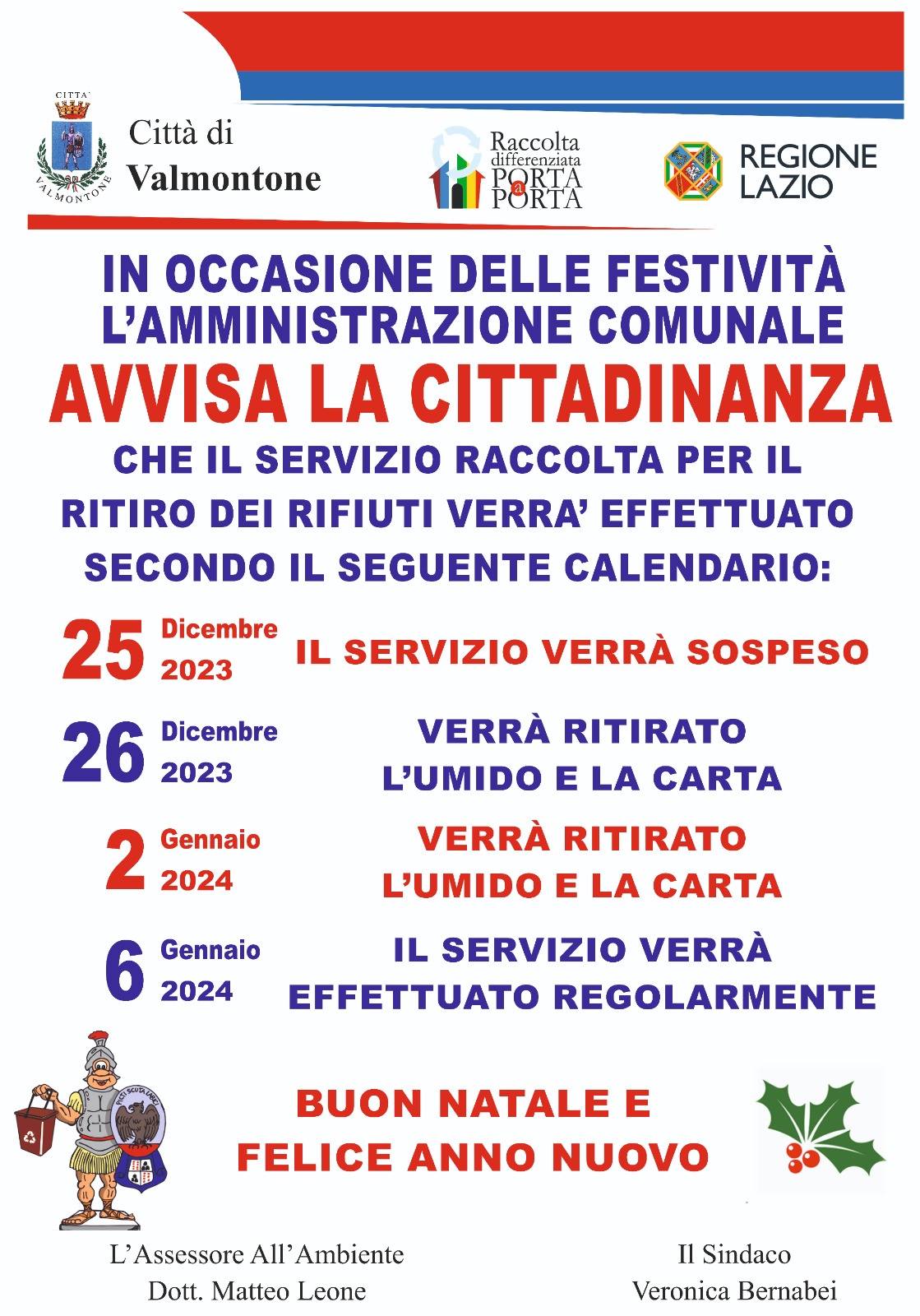 Le due giornate di festività 25 dicembre e 1 gennaio, dove il servizio sarà sospeso, verranno recuperate rispettivamento il 26 dicembre e 2 gennaio dove verrà effettuato doppio servizio con ritiro sia di carta che dell’umido. Servizio ordinario garantito nelle restanti date compreso il 6 gennaio.