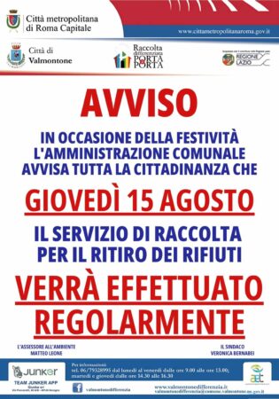 Si informa la cittadinanza di Valmontone che, giovedì 15 agosto 2024, il servizio di raccolta dei rifiuti non subirà variazioni e, dunque, verrà effettuato regolarmente.