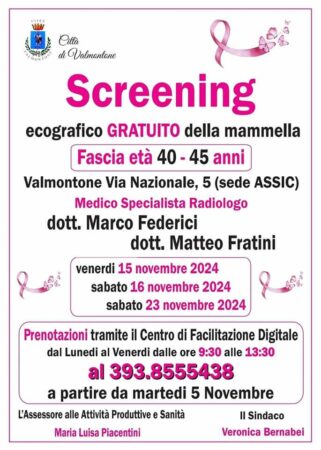 Si informa la cittadinanza di Valmontone che, a partire dal 5 novembre 2024, sono aperte le prenotazioni per lo screening della mammella.